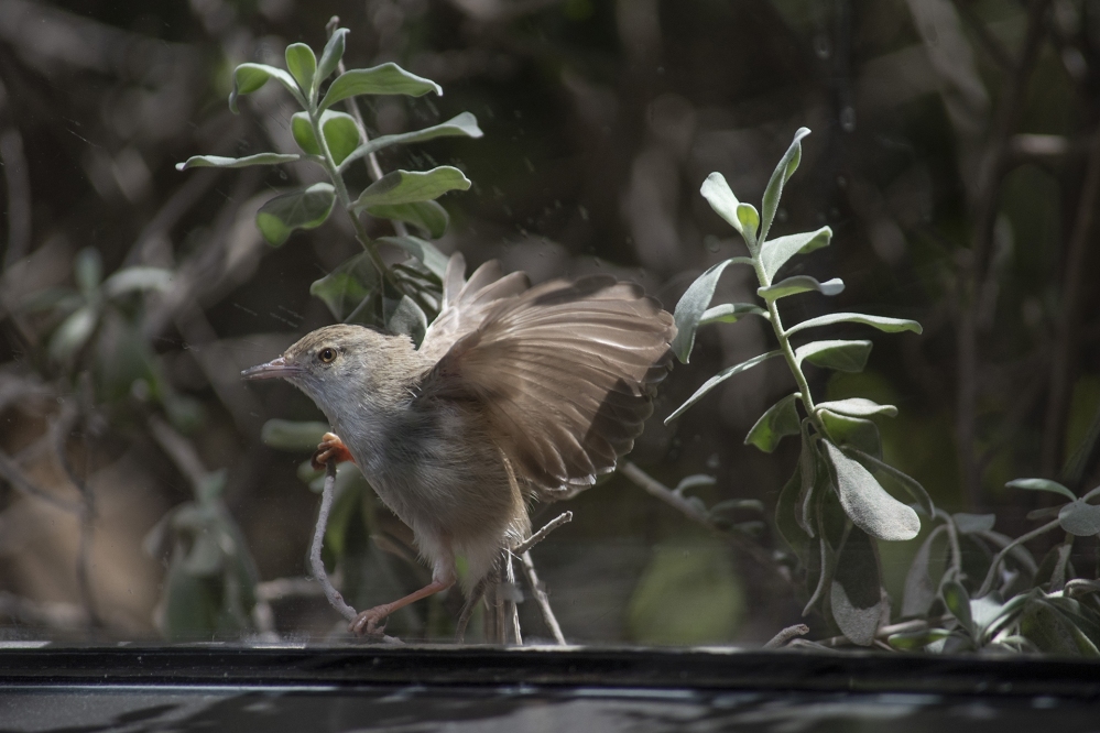 Mistaking his own reflection for another bird, this Gambaga Flycatcher is fending off his claimed territory. At the start of spring, male birds try to impress females by building a nest-like structure, which often needs defending from other males.