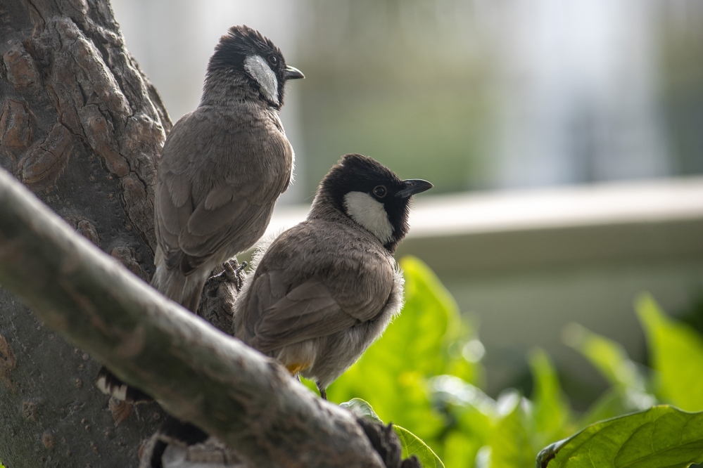 Perched on a non-native Plumeria alba branch is a pair of White-Eared Bulbul. There are no natural environments for wildlife on the island, but the people who design and live on Pearl Jumeirah plant trees, shrubs and gardens, attracting a diversity of birds, insects and small reptiles.